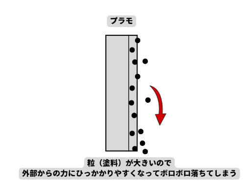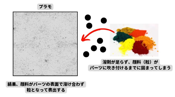 色が薄まるだけでなく、塗料がそもそもパーツに定着しないという問題も出てきます。