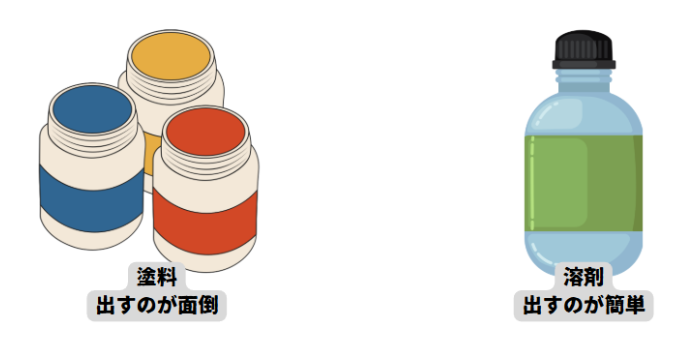 溶剤に色が付いているわけではないので、溶剤を加えれば加えるほど塗料が薄まってしまうわけですね。