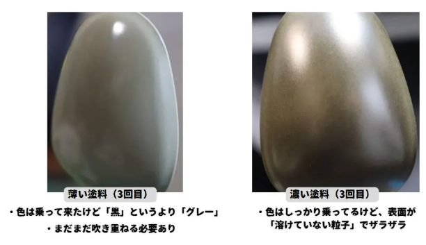 ここからは実際に「塗料が薄い/濃いとどうなるか」を別途見ていきます。