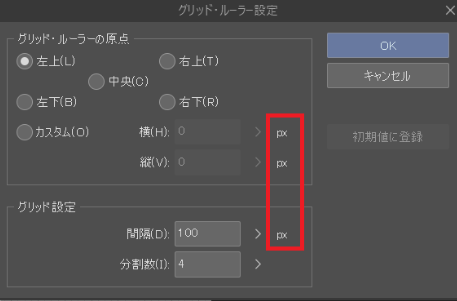 「グリッド・ルーラーの設定」の単位は、ファイルを立ち上げたときの設定で決まります