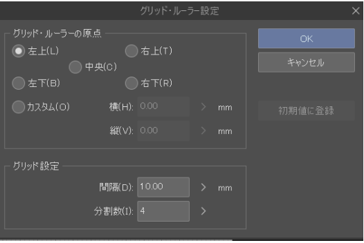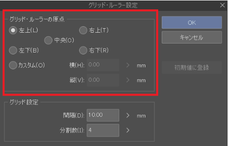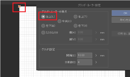 「グリッド・ルーラーの原点」「どこを起点としてグリッドを引くか」の設定です。