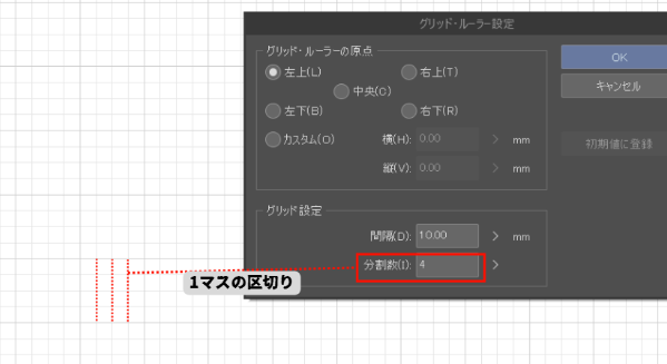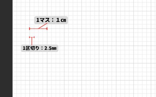 例えば「1マス1㎝」で設定しているなら「1区切り2.5㎜」ということになるので、㎜単位の設計をするときに活用できます。