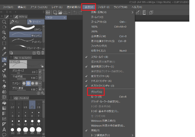 グリッドを有効化するのは、画面上部の「表示」から「グリッド」を選ぶだけです。