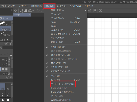 画面上部の「表示」から「グリッド・ルーラーの設定」を選択します。