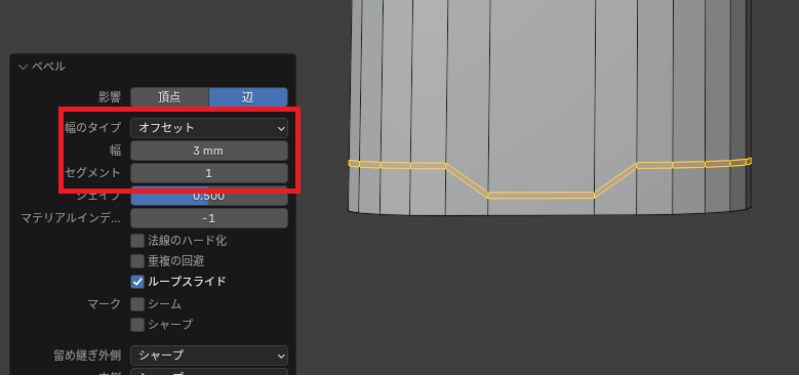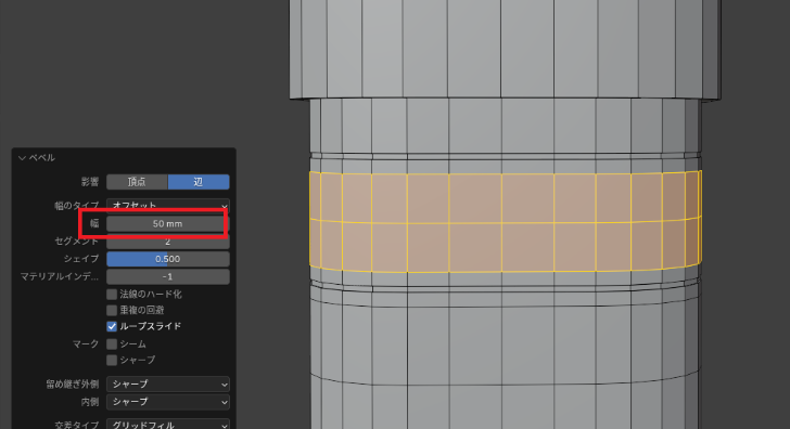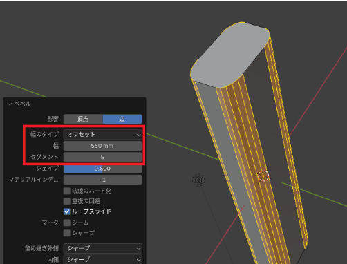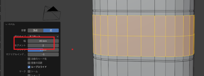 「追加した横線」を選択したまま「ベベルツール(ctrl+B)」で「幅:80㎜」「オフセット:2」にします。