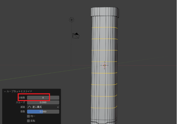 「ループカット」の時「マウススクロール」すると、辺の数を増やせます。
