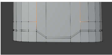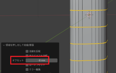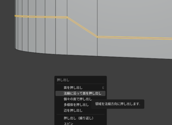 「Alt」+「E」の「法線に沿って面を押し出し」で「オブジェクト側」に凹ませて「スジ」を作ります。