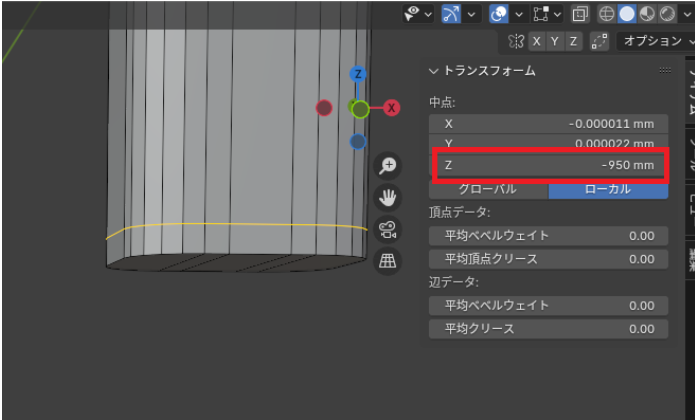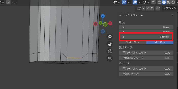 「真ん中の辺」を選択して「Z:-980㎜」まで下げます。