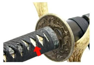 - 「柄巻き(布)」の下から覗く、ブツブツした皮地。