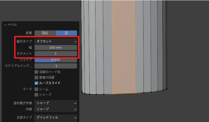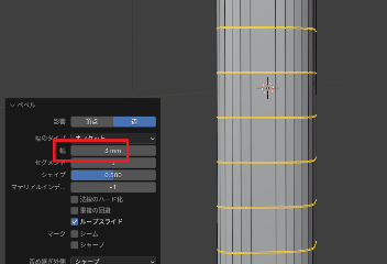 縦線を入れたら、縦線を選択した状態で「Ctrl」+「B」で「ベベル」をします。