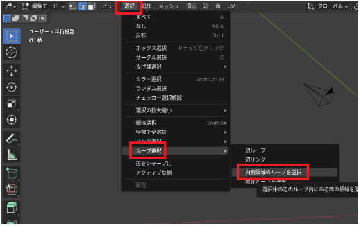 そして「全ての菱形の辺が選択されている状態(裏側含む)」で「選択」➔「ループ選択」➔「内側領域のループを選択」します。