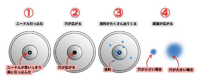 「穴(口径)」から塗料が出るわけですが、「ニードル」が穴を塞いでいる間は塗料は出てきません。