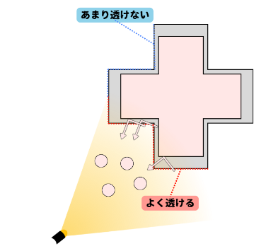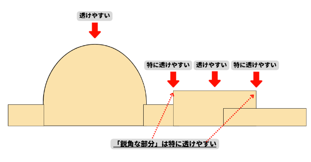 「透けのメカニズム」が分かったところで、製作により重要な「透けが起きやすい場所」「透けが起きにくい場所」をより具体的に見ていきます。