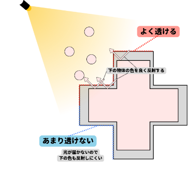 光がたくさん当たると、反射する光も多くなって結果的に「下の色」も透ける