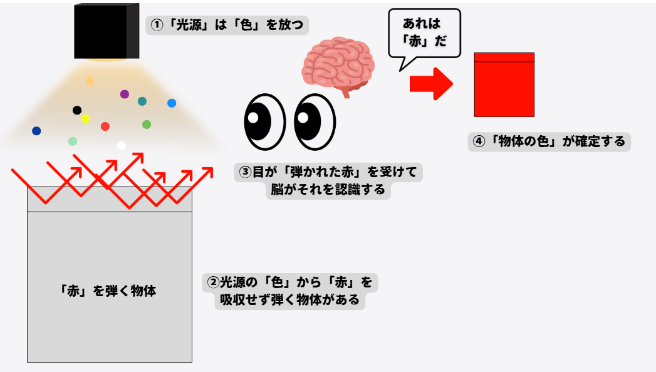 「色」というのは↓の画像のように「光(色)が物体に反射して、自分の目に跳ね返ってきた」時に認識できます。