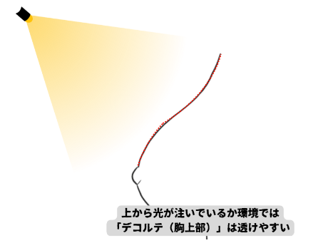 我々は普段「上から光を浴びる」という環境で暮らしているかと思いますが、そうなると↓のように「上部ほどよく透けて」「下部はあまり透けない」となります。
