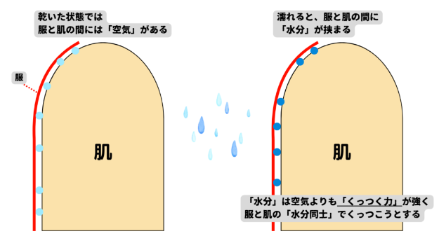これは「上地と下地の間に水分」が入り込むことで、「濡れた服」と「濡れた肌」がくっつくためです。