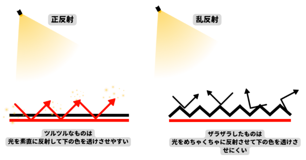 「滑なか」になると「質感(素材)」で述べた「正反射」が起こりやすくなり、下の物を透けやすくなるのです。