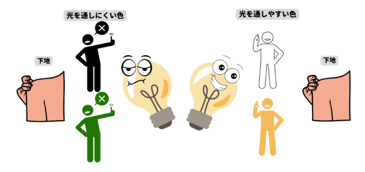 があるのですが、その「光を通しやすい色」は「下地の色」を透かしやすいです。